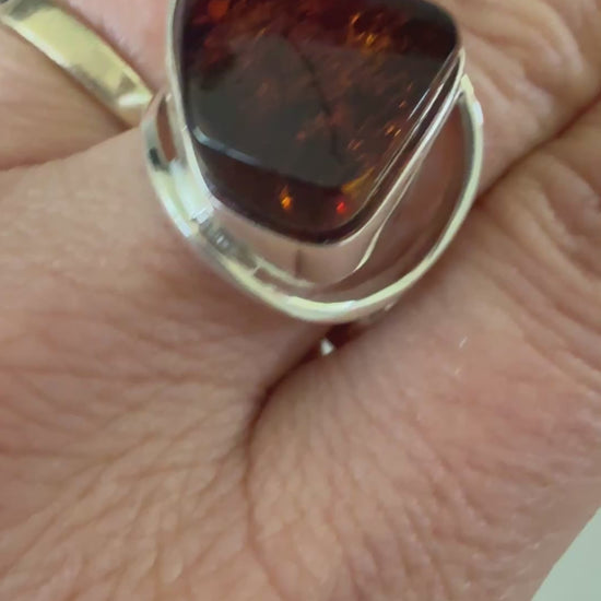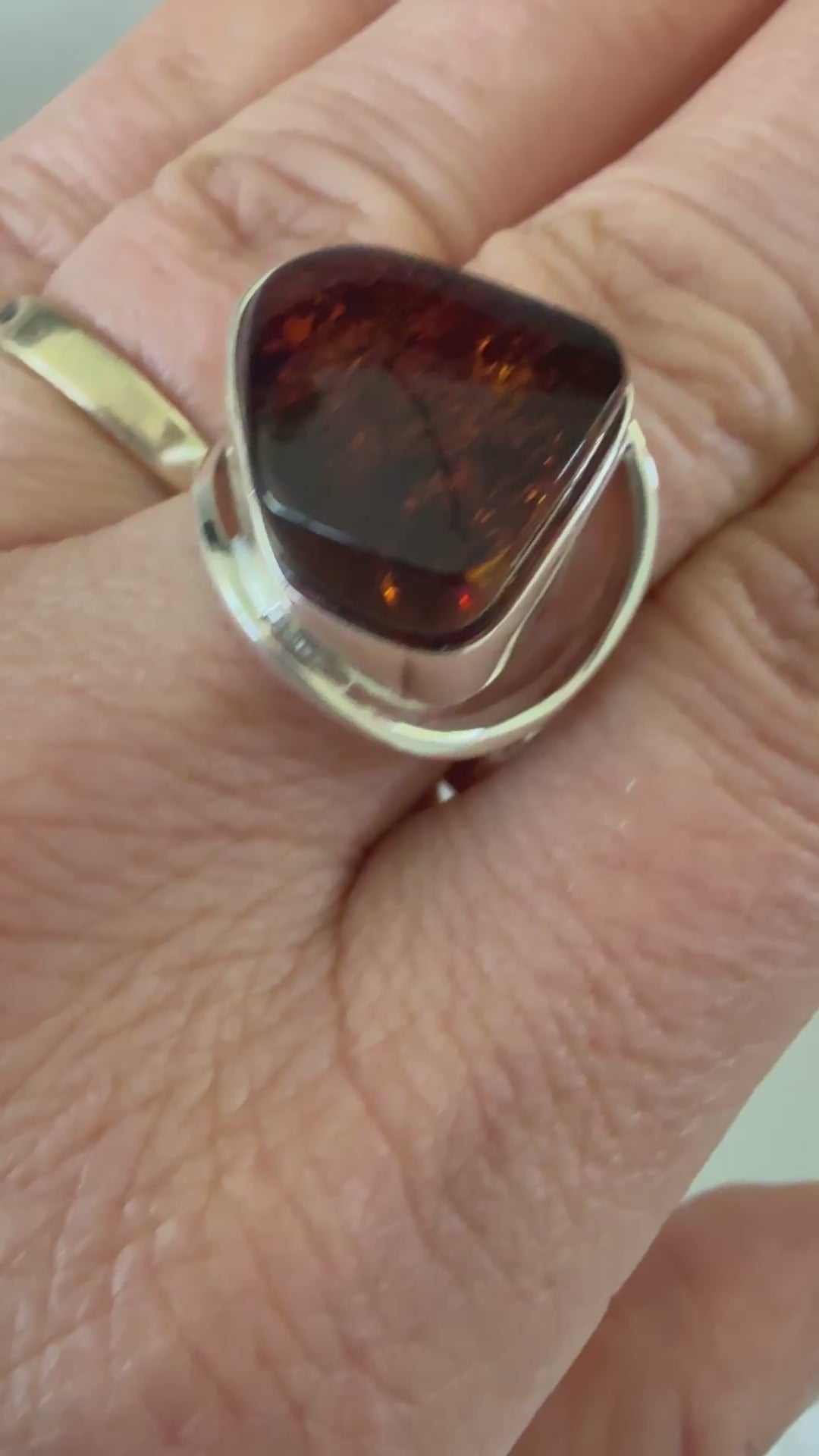 Celebrate your individuality with this one-of-a-kind Deep Cognac Amber & Sterling Silver Spiral Ring, where modern design meets timeless natural beauty.