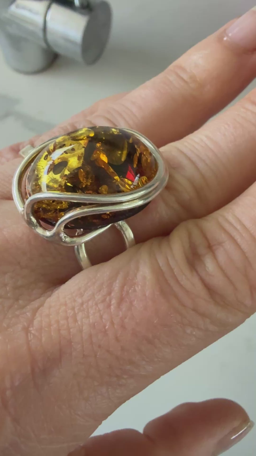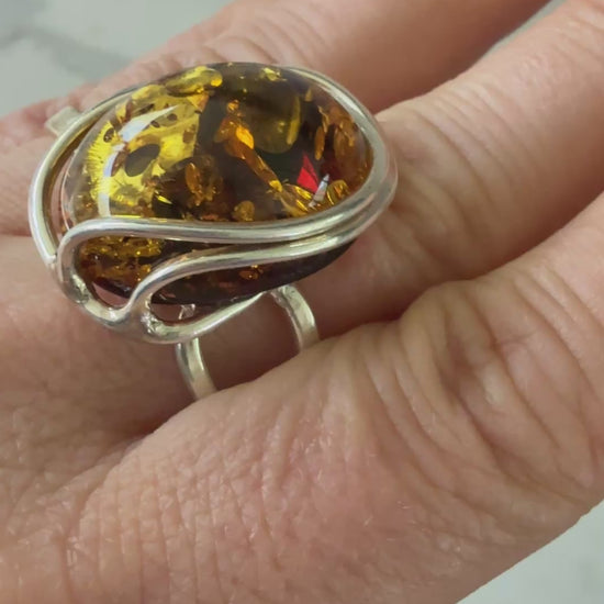 This stunning Glow amber ring reveals its true magic in daylight, where its colour gracefully shifts from a warm cognac to a deep, rich cherry hue. The natural play of light brings out its inner glow, making it a captivating piece that transforms with every glance.