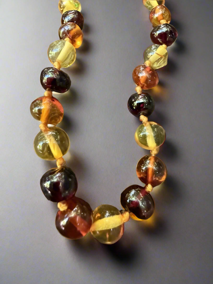Amber beads are a fabulous natural solution to assist your child through the misery of teething - without drugs! These are not designed to be chewed, It's belived that when worn against the skin the beads release natural oils that are absorbed, soothing aches and pains. They have been used through the centuries for healing, pain relief and to boost the bodies immune system. Amber House necklaces are lightweight and comfortable for your child to wear and they look fantastic.