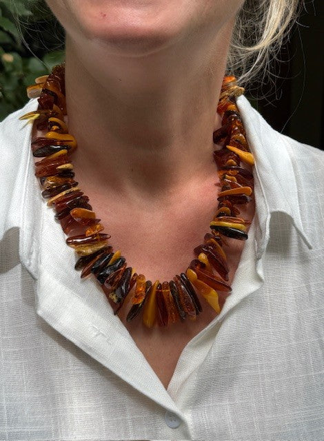 Embrace the raw and organic beauty of this captivating big chip amber necklace. Each piece of amber is a unique, naturally formed chip, showcasing this ancient gem's rich, warm hues and inherent textures. This necklace is a statement piece, celebrating the untamed beauty of nature